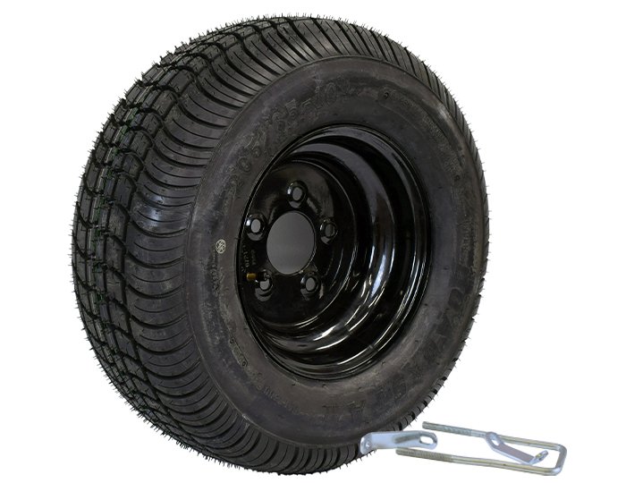 The spare tire includes a lockable attachment for secure mounting to your trailer frame (lock required).